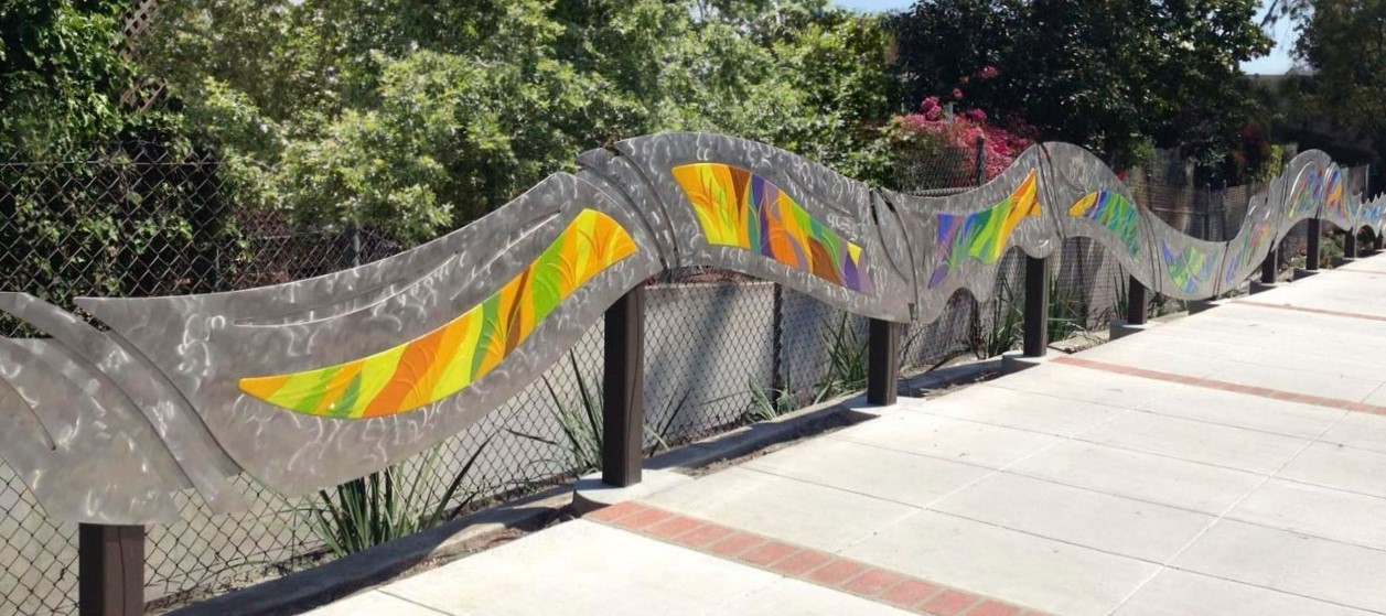 Locally, her pieces in the City of Laguna Beach public art collection include “Colors of the Canyon” on Broadway near Forest Ave. The spectacular fence, measuring 72 feet long, features undulating steel panels inset with vibrantly colored glass whose production was assisted by local artist Maggie Spencer. Another is “Steps in the Sand” at Crescent Bay Villas, 1575 N. Coast Highway in north Laguna. Commuters heading into town view the metal wall panels with cutouts of figures from an indigenous American, to a Spanish padre, to present day residents. In South Laguna, citizens enjoy “Wave Dance” on Wesley Drive, featuring jumping dolphins, and at The Old Pottery Place Center, pedestrians and shop-goers enjoy the “Greetings From Laguna” fencing, with ceramic relief insets of scenery by local artist Sherry Bullard.